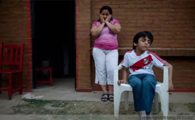 4月1日,在阿根廷查科省的甘塞多,SilviaAlvarez靠着她家红色的砖上照看儿子EzequielMoreno,他患有先天性积水。Alvarez指责喷洒农药导致她两次流产,并对她儿子的健康造成影响。张胡子