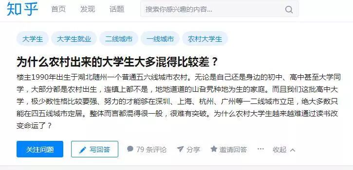 近日,在知乎上一则“为什么农村出来的大学生大多混得比较差?”的提问引起了网友的广泛讨论。题主是一个来自五六线小城农村的孩子,毕业后发现身边的来自农村的朋友普遍混得不好,于是提出了关于农村大学生为什么越来越难通过读书改变命运的疑问。