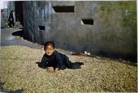 “万恶的旧社会”的 在花生堆里的男孩,背后是碉堡