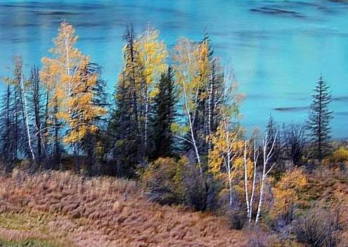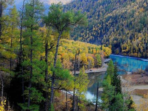 喀纳斯的水在不同的季节呈现出不同的色彩。5月的湖水,冰雪消融,湖水幽暗,呈青灰色;到了6月,湖水随周山的植物泛绿,呈浅绿或碧蓝色。