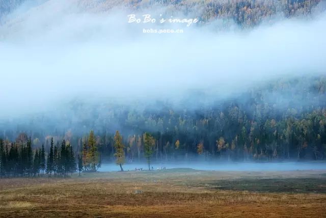 爬上禾木村周围的小山坡,可以俯视禾木村以及禾木河的全景,那一排排整齐的图瓦人小木屋,和周围的环境是如此得自然和谐。如果你早上起得来,还能俯瞰到烟雾缭绕的禾木村。