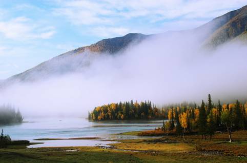 湖畔遍地的花朵,天空飘散着淡淡的薄雾,恍若置身仙境。这里还有神秘的图瓦人,可以领略别样的异域风情。如果你敢于挑战,还可以尝试徒步穿越喀纳斯。