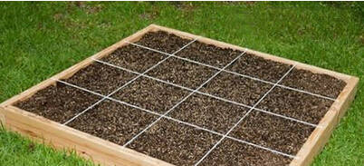 将木板条或绳子固定在木框上,将小菜地划成4行4列,总共16小格。注意木板条或绳子只是把菜地表面划成格子,并没有把下面的土隔开。
