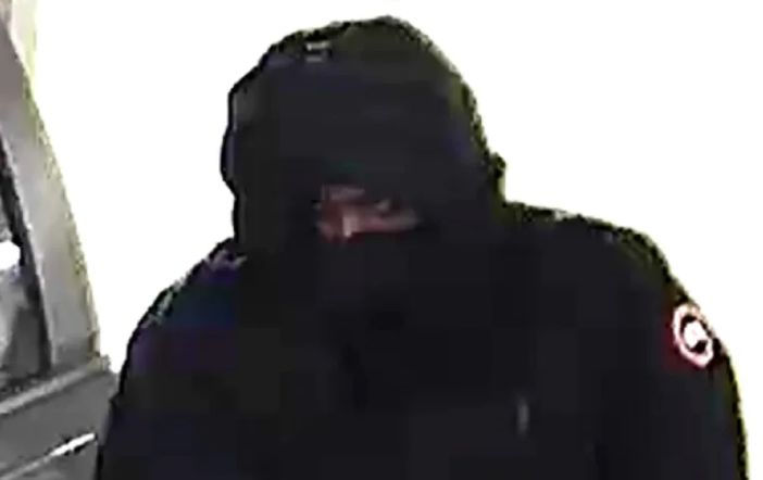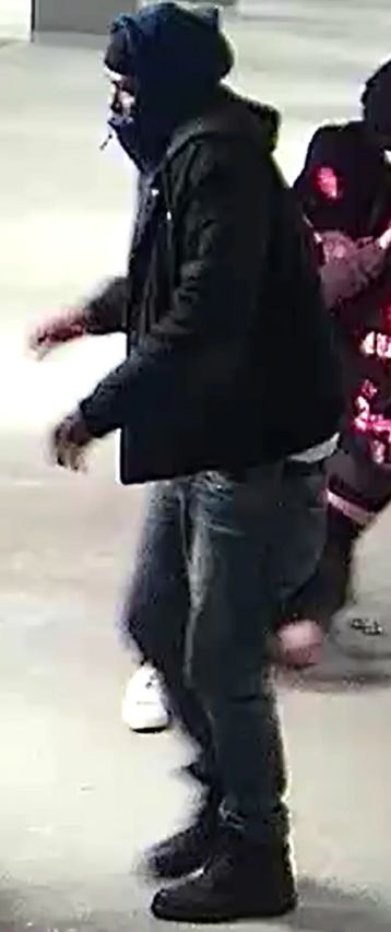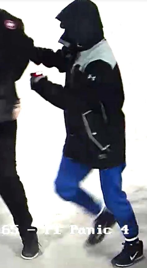 % [; E( h6 E" ], H 一号绑匪身穿蓝色牛仔裤,黑色外套,黑色Nike运动鞋。