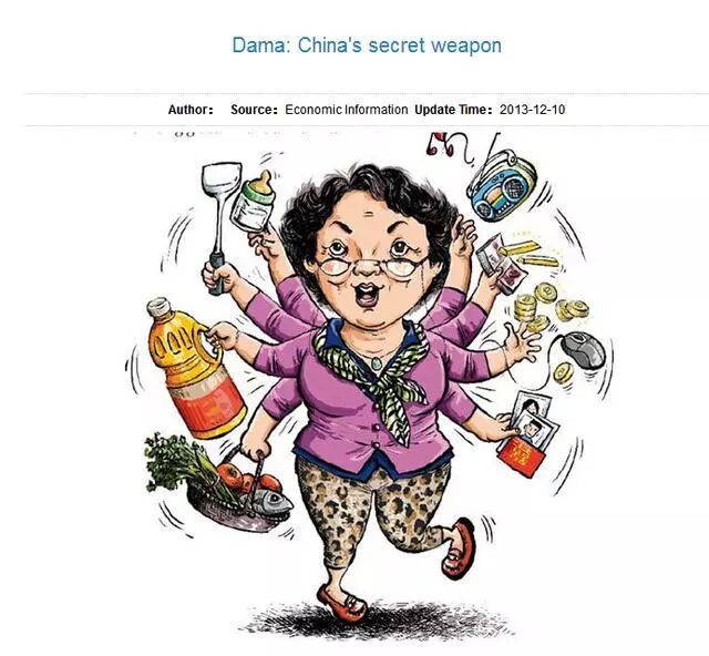 1 ~- X+ L# _% b9 {# H' }" ~: e/ e. A 《华尔街日报》甚至专门创造了一个英文单词“dama”来形容“中国大妈”。解释是:中老年女性,大多数偏胖,精神饱满,声音大:走路成堆,排队加塞;较富余,喜购物,装束臃肿,热衷拍照,喜欢佩戴鲜艳丝巾。 " ~9 b& B3 W$ j0 I, h