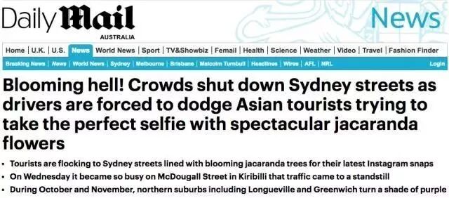 每日邮报也曾经发布过一篇关于中国游客悉尼占道采花、嬉戏打闹的报道。 + s& }1 q4 [# E