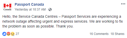 由于断网,这个突然的事故导致全加拿大各护照中心处理“紧急及速递服务”的进程受到影响,加拿大护照办公室表示将努力尽快修复问题。 N" \* o2 @% I' `& x$ n! f! a