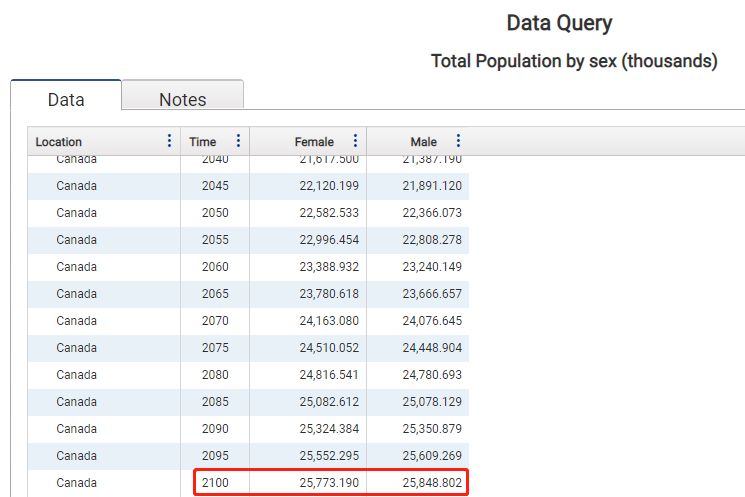 8 p$ V# f1 N A1 A 原来,联合国经济和社会事务部一直有对全球人口进行统计和预测,也确实有有男女比例的数据,当查找了加拿大的数据后,可以看到该组织对本世纪末(2100年)的加拿大男女人口预测是女性25773190人、男性25848802人,男性还比女性多一些。小编算了一下,男女比例是1.0029:1!3 P6 @ K8 u4 b