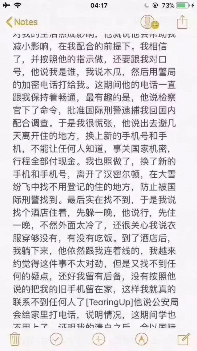 周日晚,刘悦(Yue "Kandy " Liu,音译)意识到这是一场诈骗,打开手机后,大量短信和电话蜂拥而至,告诉她这其实是一种诈骗,她根本就没有危险,其家人也很安全,所以她就主动联系了当地警方。