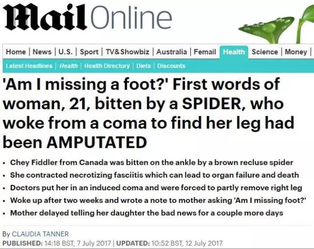 但是如果尽量远离草丛,加上政府有立标牌警示人们,蜱虫还是很少能见到的,但是被蜘蛛咬一口就被截去一条腿,还昏迷了数天,而且不知道将有怎样的后遗症,这听起来更吓人有没有!