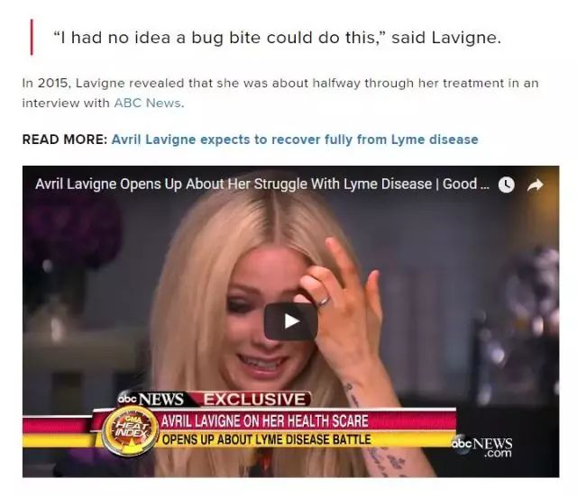 除此之外,一些品种的蜱虫携带的病菌还可造成莱姆病(Lyme disease),可导致严重的后遗症,神经,内脏还有肢体都会有不同程度的受损,甚至因此丧命,而且莱姆病的最初症状和其他常见病容易混淆,非常难以确认,所以治疗起来又费时间,患者又痛苦,加拿大流行乐小天后Avril Lavigne和歌手Shania Twain都曾被蜱虫咬过,花费了几年时间才慢慢恢复,不过日后还是有复发的可能。