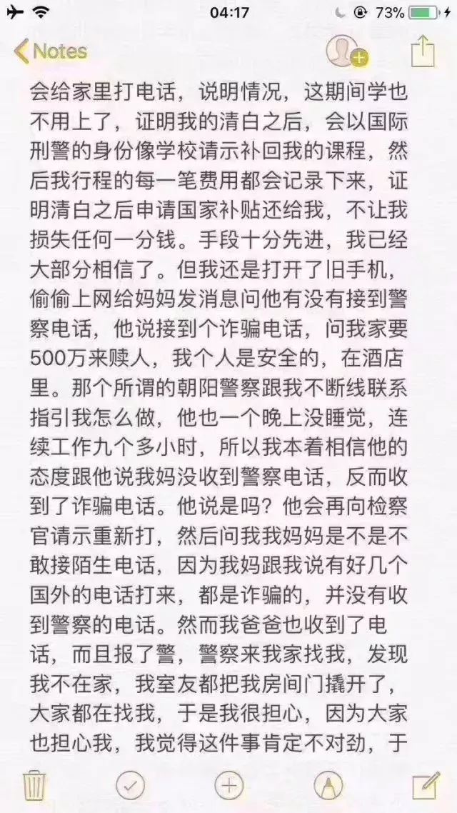 周日晚,刘悦(Yue "Kandy " Liu,音译)意识到这是一场诈骗,打开手机后,大量短信和电话蜂拥而至,告诉她这其实是一种诈骗,她根本就没有危险,其家人也很安全,所以她就主动联系了当地警方。