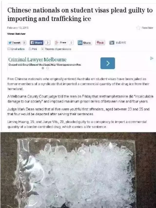 此外, 5名中国留学生在从中国回到澳大利亚时, 被查出行李中有大量冰毒,疑与贩毒团伙有关。